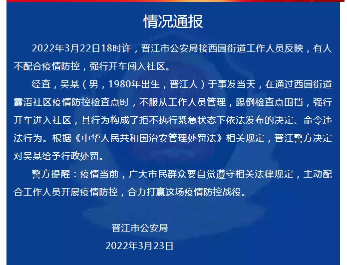 2022年3月22日18时许,晋江市公安局接西园街道工作人员反映,有人不配合疫情防控,强行开车闯入社区。